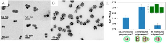 TEM images of dimer and trimer (A) and centrosymmetric (with more than 4 nanocubes) (B) iron oxide nanoclusters; (C) SAR values of the different nanoassemblies shows that dimer and trimer structures have the highest SAR values. Adapted from [158] with permission from American Chemical Society 2020.