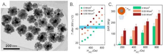 (A) TEM image of Ag/Fe3O4 nanoflowers; (B) Temperature reached after 300 s of heating for different ac field intensities. The therapeutic temperature window (blue zone) is reached for lower magnetic field intensities when a laser is applied; (C) SAR values of Ag/Fe3O4 nanoflowers as a function of AC field intensity (HAC) for different laser power densities. SAR values are the highest when a laser is simultaneously applied. Adapted from [162] with permission from American Chemical Society, 2020.