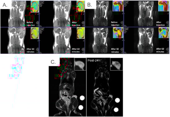 T1- (A) and T2-weighted (B) in vivo MR images before injection, immediately after and after 30 and 60 minutes of silica coated nanocubes. The contrast enhancement is clearly observed in the coronal images of the kidney. Adapted from [124] with permission from Royal Society of Chemistry 2020. (C) T2-weighted in vivo MR images before (left) and 24 h after (right) injection of BSA-coated nanocubes into mice bearing U87-MG tumor cells. The darkening of the tumor mass is clearly visible after the injection of nanoparticles. Adapted from [175] with permission from MDPI 2020.