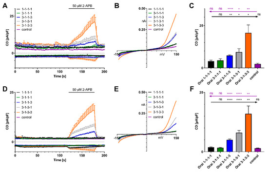 - Amcheslavsky, A.; Safrina, O.; Cahalan, M.D. State-dependent block of Orai3 TM1 and TM3 cysteine mutants: Insights into 2-APB activation. J. Gen. Physiol. 2014, 143, 621–631. [Google Scholar] [CrossRef] [PubMed][Green Version]