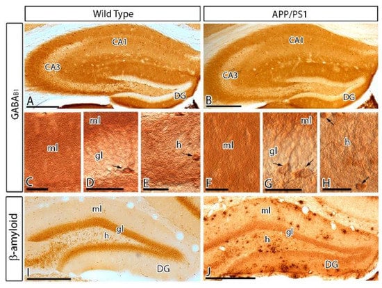 - Martín-Belmonte, A.; Aguado, C.; Alfaro-Ruíz, R.; Moreno-Martínez, A.E.; de la Ossa, L.; Martínez-Hernández, J.; Buisson, A.; Früh, S.; Bettler, B.; Shigemoto, R.; et al. Reduction in the neuronal surface of post- and pre-synaptic GABA B receptors in the hippocampus in a mouse model of Alzheimer’s disease. Brain Pathol. 2019, 12802. [Google Scholar] [CrossRef]