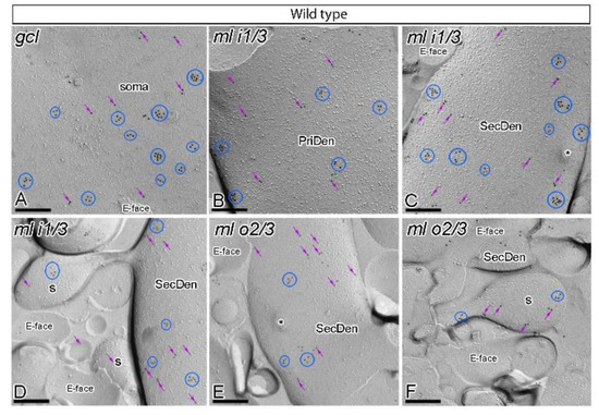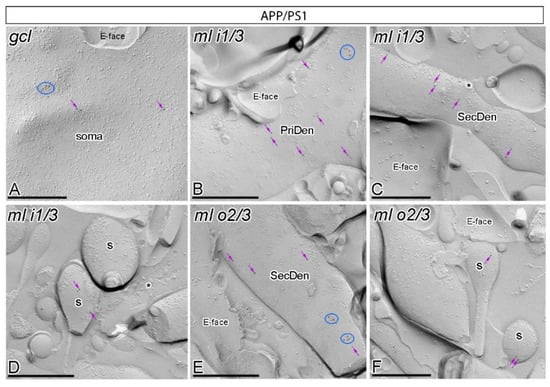 Subcellular localisation of GABAB1 in somato-dendritic domains of granule cells in APP/PS1 mice. (A–F) Electron micrographs obtained from different parts of the DG showing immunoparticles for GABAB1 along the surface of granule cells, as detected using the SDS-FRL technique in APP/PS1 mice at 12 months of age. Immunoparticles for GABAB1 were detected at lower frequency forming clusters (blue ellipses/circles) or scattered (purple arrows) associated with the P-face in the soma, primary dendrites (PriDen), secondary dendrites (SecDen) and dendritic spines (s) of both the outer two thirds (ml o2/3) and inner one third (ml i1/3) of the molecular layer. Fractured spine necks are indicated with asterisks (*). The E-face is free of any immunolabelling. Scale bars: A–F, 0.2 μm.