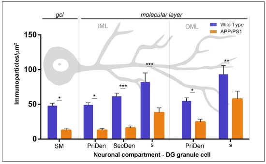 Next, we performed a quantitative comparison of the GABAB1 densities in the six different somato-dendritic compartments of granule cells (Figure 4). In wild type, this analysis showed that GABAB1 was not evenly distributed along the neuronal surface in granule cells, but, instead, there was a graded increase in the density of GABAB1 immunoparticles from the soma to the dendritic spines (Figure 4). This distribution gradient was also detected in granule cells from APP/PS1 mice (Figure 4). However, our analysis demonstrated that GABAB1 density along the neuronal surface was significantly reduced in all compartments analysed in granule cells of the APP/PS1 mice compared to age-matched control mice at 12 months of age (two-way ANOVA test F(1,192) = 70.78, p < 0.0001 (genotype) and Bonferroni post-hoc test, * p < 0.05; ** p < 0.01; *** p < 0.001) (Figure 4).