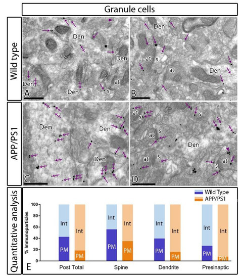 Finally, to explore the possibility that the reduction in GABAB1 along the membrane surface is due to its internalisation and accumulation at intracellular sites of granule cells and axon terminals of APP/PS1 mice at 12 months of age, we used the pre-embedding immunogold technique and quantitative analysis on tissue blocks taken from the inner molecular layer of the DG, where larger differences were detected in the density for GABAB1 between wild type and APP/PS1 mice.