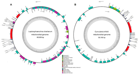Circular mapping of the complete mitochondrial genome from (A) L. chartarum and (B) C. trifolii. The two mitogenomes were annotated using MFannot and were used to construct their graphical maps using OGDRAW (http://ogdraw.mpimp-golm.mpg.de/cgi-bin/ogdraw.pl).