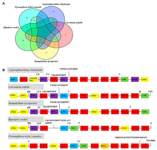 Comparison of the mitogenome components in L. chartarum, C. trifolii and related species. (A) Gene content comparison among Pyrenophora tritici-repentis, L. chartarum, C. trifolii, Bipolaris cookei, Stemphylium lycopersici mitogenomes. (B) Comparative analysis of nucleotide sequences for each protein-coding gene, two ribosomal DNA genes among Pyrenophora tritici-repentis, L. chartarum, C. trifolii, Bipolaris cookei, Stemphylium lycopersici. The same genes are marked with the same color.