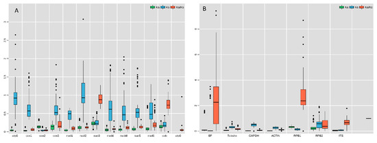Evolutionary rates of the mitochondrial genes (A) and nuclear genes (B). The Ka (non-synonymous) and Ks (synonymous) values, as well as their Ka/Ks ratio appear as green, blue and red box plots, respectively. The bar represents standard deviation (SD), median and epitomizes values between the first quartile and the third quartile of Ka, Ks and Ka/Ks.