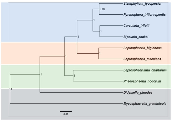 To determine the phylogenetic relationships of C. trifolii and L. chartarum, two datasets for the nuclear genome and mitochondrial genome were selected. Since the class Dothideomycetes includes the orders Botryosphaeriales, Pleosporales, and Capnodiales, Mycosphaerella graminicola (Capnodiales) was selected as an outgroup when the phylogenetic tree was constructed.