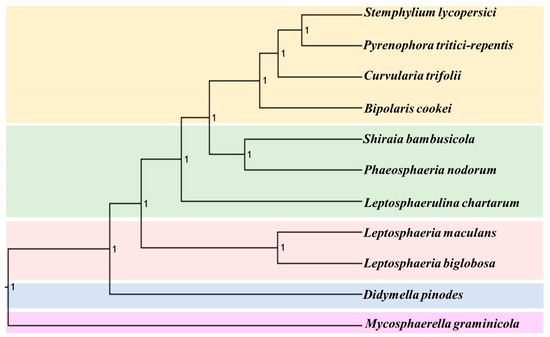 To acquire additional evidence for the classification of Pleosporales species, and to understand the evolutionary history of the mitochondrial genome, we conducted separate phylogenetic analyses for individual genes as well as for the combined nuclear and mitochondrial DNA datasets (Figure 6 and Figure 7). Differences were observed in the topologies of the phylogenetic trees generated by individual nuclear genes and mitochondrial genes (Figures S5 and S6). However, their evolutionary relationships appeared to be interdependent. For the phylogenetic relationship inferred based on the combined nuclear genes, the results showed that C. trifolii were found to be sister groups of B. cookei, P. tritici-repentis and S. lycopersici with high confidence (Figure 6). Moreover, this group clustered with clades containing species in Leptosphaeria, and Parastagonospora. M. graminicola was located in the basal position of the phylogenetic tree. Similarly, the phylogenetic tree inferred from mitochondrial genomes showed that C. trifolii clustered with S. lycopersici, P. tritici-repentis and B. cookei, which clustered with the clade containing P. nodorunm and Skeletocutis bambusicola (Figure 7). We found that two species in Leptosphaeriaceae were clustered together, and L. maculans was located in the medium position of these two clades. It appeared that Didymella pinodes is at a greater genetic distance from other species in the Pleosporales order.