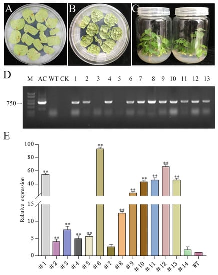 To further study the potential biological functions of PtrMTA, we cloned the MTA gene from Populus trichocarpa and constructed a 35S overexpression vector. Next, we performed genetic transformation through the leaf disc method [] (Figure 1A). The leaves can differentiate into adventitious buds under light culture conditions (Figure 1B). Through screening for resistance, we initially obtained PtrMTA-overexpressing transgenic plants (Figure 1C). Every transgenic line was verified by PCR (polymerase chain reaction) and qRT-PCR (quantitative real-time PCR) (Figure 1D, E). In the literature, these two methods are usually used to verify transgenic plants. Through the verification of the two methods, we obtained transgenic poplar 84K (P. alba X P. glandulosa), i.e., 14 lines that overexpressed PtrMTA.
