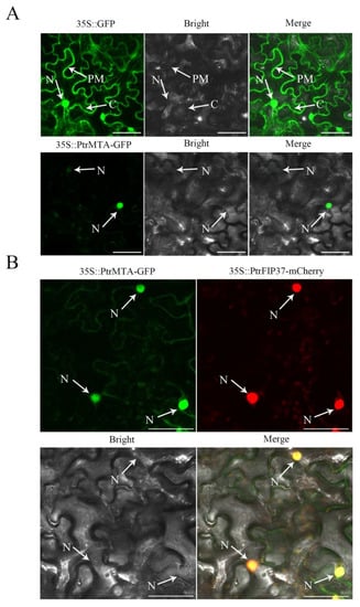 PtrMTA was targeted to the nucleus. (A) Subcellular localization of 35S::GFP and 35S::PtrMTA-GFP in transiently expressed tobacco leaves. Bar = 15 μm. (B) Subcellular co-localization of 35S::PtrMTA-GFP and 35S::PtrFIP37-mCherry in transiently expressed tobacco leaves. Bright: bright-field image; PM: plasma membrane; C: cytoplasm; N: nucleus. Bars = 18 μm.