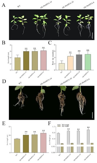 To investigate whether PtrMTA affected root development in poplar, we selected WT, OE-PtrMTA-14, OE-PtrMTA-10, and OE-PtrMTA-6 seedlings aged 20 days and potted the seedlings for 50 days. At the seedling stage, the PtrMTA-overexpressing plants showed a more developed root system than that of the WT (Figure 4A). The root length of PtrMTA-overexpressing plants was significantly longer than that of the WT (Figure 4B). In addition, the number of root tips in the PtrMTA-overexpressing plants was about five, which was also significantly higher than that of the WT (Figure 4C). Moreover, we examined the PtrMTA-overexpressing poplars that had been grown for 50 days and found that their root systems were significantly more developed than those of the WT (Figure 4D). Compared with the WT roots, the root length of PtrMTA-overexpressing plants (about 10 cm) was longer (Figure 4E). The root fresh and dry weights of different lines were measured. We found that the root weight of PtrMTA-overexpressing plants was significantly higher than that of the WT (Figure 4F). In summary, PtrMTA-overexpressing plants had a more developed root system compared with the WT.