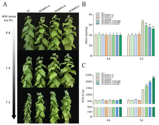 As the malondialdehyde (MDA) content is an effective indicator of the oxidative damage of the cytomembrane, we measured the changes in the MDA content in leaves of WT and PtrMTA-overexpressing poplars under drought stress. The results showed that the MDA content of OE-PtrMTA poplars was lower than that of WT poplar under drought stress (Figure 5B). Superoxide dismutase (SOD) is an important antioxidant that removes reactive oxygen species. Therefore, we tested the activities of SOD in OE-PtrMTA and WT poplars before and after drought treatment. The results showed that the activity of SOD was significantly higher in OE-PtrMTA poplars than in the WT under drought stress (Figure 5C). Except that the soil RWC remained at 70%, the control plants were maintained under the same culture conditions, and no significant differences in stem diameter and plant height were found between OE-PtrMTA poplars and the WT (Figure S3). Therefore, we can conclude that OE-PtrMTA transgenic poplars had better tolerance to drought stress.