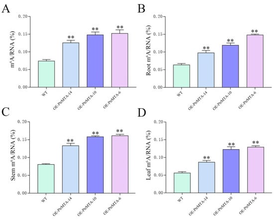 To study whether PtrMTA affected the level of m6A, we selected WT, OE-PtrMTA-14, OE-PtrMTA-10, and OE-PtrMTA-6 seedlings aged 30 days and extracted RNA to measure the level of m6A. Compared to the WT, the level of m6A was significantly higher in PtrMTA-overexpressing plants (Figure 6A). Furthermore, we also detected the m6A level in the roots, stems, and leaves of the WT and overexpressing transgenic seedlings. Importantly, we found that the level of m6A in the roots of PtrMTA-overexpressing plants was higher than that of the WT, and the m6A content in the roots of OE-PtrMTA-6 was about twice as high as that of the WT (Figure 6B). It is worth mentioning that the level of m6A in stems of PtrMTA-overexpressing plants was much higher than that of the WT (Figure 6C). In addition, the m6A content in leaves was lower than that in the roots and stems, but the m6A content in PtrMTA-overexpressing plants was still significantly higher than that in the WT (Figure 6D). These results indicate that PtrMTA is a component of m6A methyltransferase and affects the level of m6A.