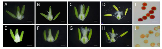 Anther phenotype and KI–I2 staining in XN1376 (A–D,I) and XN1376-CIMS (E–H,J). (A,E) Eun, early uninucleate stage; (B,F) Lun, late uninucleate stage; (C,G) Bn, binucleate stage; (D,H) Tn, trinucleate stage; and (I,J) KI–I2 staining. Scale bars are 1 mm in (A–H) and 50 µm in (I,J).