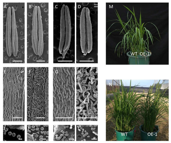 SEM was used to observe the outside epidermal cells and pollen grains from transgenic and wild-type plants. The results showed that the anthers from the wild type were large and full (Figure 2C). By contrast, the anthers from the transgenic T2 generation were short and thin (Figure 2D). Meanwhile, the outside epidermal cells showed a roughly uniform distribution in wild type (Figure 2G), which was abnormal with relatively irregular distribution in the transgenic lines (Figure 2H). Further observations showed that the pollen grains of the wild type were plump, round, and spherical (Figure 2K), while the pollen grains of the transgenic plants were sunken into other irregular shapes (Figure 2L).