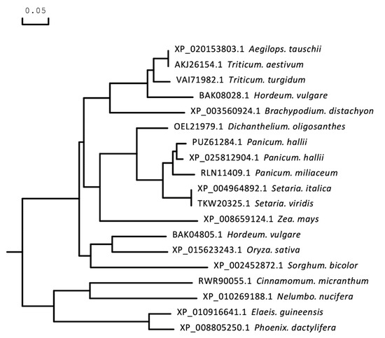 The full-length CDS of TaICK1 was identified from XN1376 using PCR. The results of agarose electrophoresis show the presence of only one DNA band corresponding to a specific product (Figure 3D). Sequencing revealed that the gene TaICK1 contained a 690 bp (Figure 3E) open reading frame that encoded 229 amino acid residues. The homology analysis indicated that the TaICK1 amino acid residue sequence has a high similarity with that of Aegilops tauschii (GenBank XP_020153803.1) and Hordeum (GenBank BAK08028.1)—99.56% and 83.26%, respectively (Figure 4).