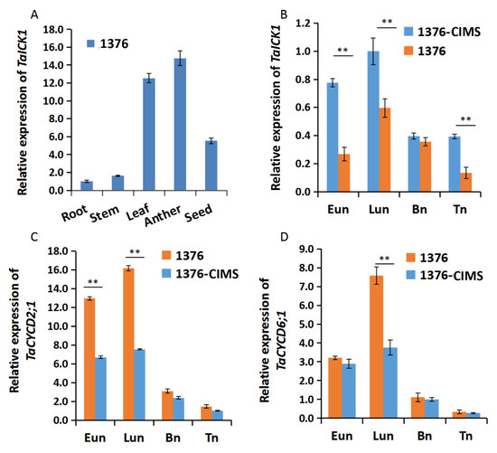 The expression patterns of TaICK1 were first studied in various tissues of XN1376. Meanwhile, the expression patterns were further measured during the stages of Eun, Lun, Bn, and Tn in XN1376-CIMS and XN1376. The expression of TaICK1 significantly differed depending on the tissue. As shown in Figure 5A, the most abundant cDNA of TaICK1 was detected in anthers, followed by leaves and developing seeds. The root and stem presented less TaICK1 cDNA compared to other tissues. Especially in root, the expression level was lower than 14 times that in anthers (Figure 5A). These results indicate that the expression pattern in wheat is organ-specific. In addition, the relative expression of TaICK1 was further analyzed in the anthers of XN1376-CIMS and XN1376 and showed an increase from the Eun to Lun stage followed by a continuous decrease from the Lun to Tn stage in XN1376-CIMS. XN1376 also exhibited a similar expression pattern: the highest expression level was detected at the Lun stage (Figure 5B). Notably, the expression of TaICK1 was higher in XN1376-CIMS than that in XN1376 at stages Eun, Lun, and Tn (Figure 5B).