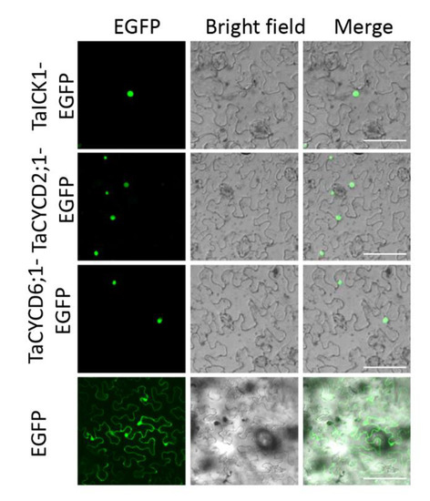 To determine the intracellular distribution of protein TaICK1, the TaICK1-EGFP construct was transformed into the leaf of Nicotiana benthamiana. Signals of the EGFP protein alone, as a positive control, were distributed throughout the cell (Figure 7). By contrast, the green fluorescence of the TaICK1-EGFP fusion protein was only detected in the nucleus (Figure 7).
