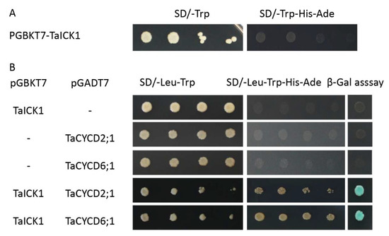 The pGBKT7-TaICK1 plasmid failed to autonomously activate reporter genes in the yeast strain Y2H Gold (Figure 8A). Hence, this plasmid could be used to screen the yeast library. Ultimately, a total of 24 individual yeast clones were obtained, in which AF512432.1 (NCBI) and AK450777.1 (NCBI) were identified and annotated as TaCYCD2;1 and TaCYCD6;1, respectively. TaCYCD2;1 and TaCYCD6;1, which have been identified as being involved in the regulation of the cell cycle, were selected for further analysis. In addition, both the TaCYCD2;1-EGFP and TaCYCD6;1-EGFP fusion proteins were localized to the nucleus in the epidermis leaf cells of Nicotiana benthamiana (Figure 7). The respective protein molecular weights of TaCYCD2;1 and TaCYCD6;1 were approximately 38 and 33 kDa after subtracting the 48 kDa trigger factor protein tag (Figure 3B,C).
