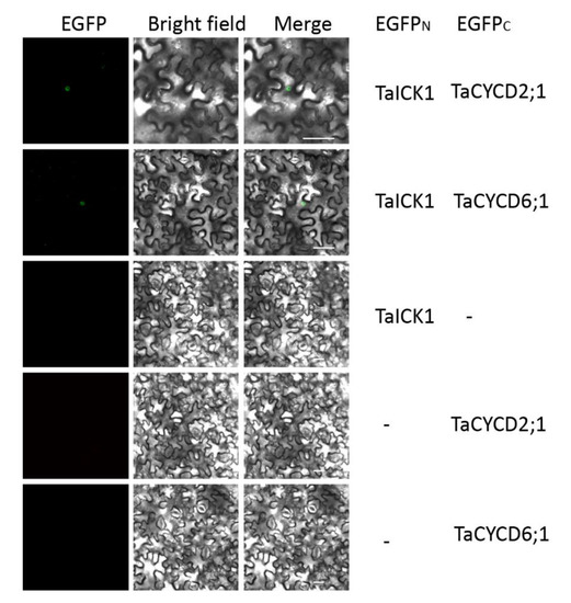 The interaction of TaICK1 with CYCD2;1 and CYCD6;1 in the BiFC system. Fluorescence (EGFP), bright field, and merged images were obtained using a confocal microscope. The scale bars are 50 µm.