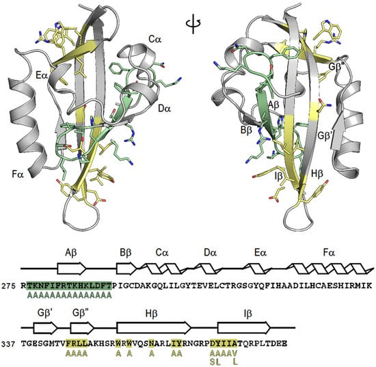Structure and sequence of the mouse aryl hydrocarbon receptor (AhR) (Pubmed sequence: NP_038492.1) and map of generated mutations. The structure of the AhR PASB is taken from the homology model []. Structural elements of the AhR PASB homology model are indicated both in the structure and above the sequence. Mutants in A and B strands (N-terminal) are colored in green, while mutants in the G, H, and I strands (C-terminal) are colored in yellow.