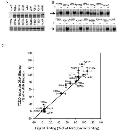 Effects of mutagenesis of amino acids 276–290 of the AhR PASB on 2,3,7,8-tetrachlorodibenzo-p-dioxin (TCDD)-inducible AhR transformation/DNA binding and [3H]TCDD specific binding. (A) In vitro protein expression of AhR mutants. Indicated AhR constructs were synthesized in vitro in the presence of [35S]-methionine and resolved by SDS-PAGE and autoradiography. (B) In vitro synthesized wild type (wt) or mutant AhRs and ARNT were diluted at 1:1:8 (v/v/v) ratio (AhR:ARNT:buffer), transformed in the presence of 10 nM TCDD (T) or 1% DMSO (v/v) for 3 h, and protein-DNA complexes analyzed by gel retardation analysis. A representative gel is shown and the specific protein-DNA complex is indicated with an arrow. (C) Comparison of ligand binding and ligand-dependent DNA binding for wt and mutant AhRs. [3H]TCDD binding to the in vitro synthesized AhR in the presence ARNT, diluted at 1:1:8 (v/v/v) ratio (AhR:ARNT:buffer), was analyzed by hydroxyapatite assay following 1 h of incubation at room temperature in the presence of 10 nM [3H]TCDD. Values were normalized to those obtained with unprogrammed lysate (non-specific binding control) and plotted vs corresponding values of the TCDD-inducible protein-DNA complex for each AhR from gel retardation experiments (panel A). Values represent the mean ± standard deviation of triplicate independent binding reactions. Data points overlapping with the trend line would indicate a proportional change in ligand binding and DNA binding for the indicated mutant AhR (i.e., unchanged transformation efficiency; see text). Note: F281A was constitutively active in DNA binding (2B); however, since it demonstrated no ligand-dependent increase in DNA binding, the resulting ligand-dependent change in DNA binding was low and similar to that of inactive AhRs (2B). Results presented are representative of at least three independent experiments.