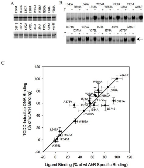 Among the C-terminal mutations (from F345 to A375), several (F345A, R346A, L347A, and A375L) exhibited little or no ligand-dependent DNA binding of the AhR (Figure 3B), similar to their lack of [3H]TCDD binding (Figure 3C). Interestingly, the A375V mutation impaired AhR ligand binding to a greater degree than DNA binding (compare ~30% to 55%, respectively). Previous analysis demonstrated that Ala375 is centrally located inside the ligand binding pocket and its mutation to Val results in a decrease in AhR ligand binding affinity that appears to be responsible for the lowered sensitivity of DBA mice (which contain V375A) to TCDD, compared to C57BL mice (which contain A375) [,]. For the majority of the remaining mutations, the relative ligand binding activity and ligand-dependent transformation/DNA binding activity of mutant AhRs were directly proportional (Figure 3C). Similar to the results in Figure 2C, the diagonal distribution of DNA binding versus ligand binding plot of the mutant AhRs (with some exceptions, as discussed below) indicates that, while their transformation efficiency was not significantly altered relative to that of the wtAhR, their overall functional activity did vary (Figure 3C). It appears that, although specific mutations within the PASB domain may result in decreased functional activity of the AhR protein, it does so without affecting its level of protein expression (Figure 3A). The mechanism(s) of this apparent decrease in functional response remains to be determined.