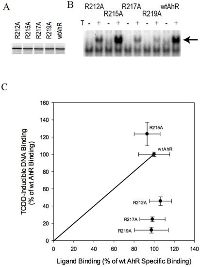 In addition to the PASB domain, a highly conserved Arg-Cys-rich region located in the PASA domain of the AhR (aa 212–220) (Supplemental Figure S1) has been previously suggested to be important in transformation/DNA binding []. Within this region, we previously observed that Arg217 was likely involved in a ligand-dependent conformational change in the AhR, becoming more exposed following ligand binding, and this effect appeared to occur independently of the presence of ARNT []. Accordingly, mutations in the Arg-Cys-rich region could result in interference with ligand-dependent AhR transformation. To test this hypothesis, ligand-dependent transformation/DNA binding of AhRs containing mutations within the Arg-Cys-rich region (R212A, R215A, R217A, and R219A) were examined. All mutations were synthesized in vitro at levels similar to that of the wtAhR (Figure 4A). Of these four mutations, all but R215A resulted in decreased levels of TCDD-dependent AhR transformation/DNA binding (Figure 4B). The lack of effect of the R215A mutation is not surprising as this arginine is not present in the AhR of many species (Supplemental Figure S1). Since ligand binding was not reduced with any of these mutations (Figure 4C), the reduced DNA binding observed with the R212A, R217A, and R219A mutants resulted from impaired AhR transformation/DNA binding. While these results are similar to the effects observed with the D371A substitution, mutations in the Arg-Cys-rich region had a significantly greater impact on AhR transformation/DNA binding.