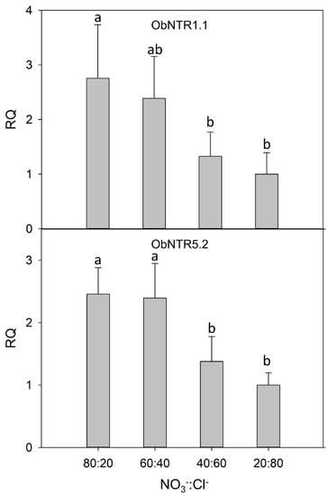 The expression analysis of the two putative nitrate transporters (ObNPF1.1 and ObNPF5.2) confirmed their expression in leaves and revealed differences according to the NS ratios. A clear distinction was present for the extreme R. The transcriptional regulation of nitrate transporters is complex. A plethora of factors can induce the transcription of NTs, although much information is linked to lateral root growth and N-uptake and starvation [,]. The observed upregulation by nitrate in leaves is consistent with a possible role in NO3− transport or removal from the xylem []. Nonetheless, the expression of NTs is also affected by stress and in particular, by chlorine ions. The concomitant variation in nitrate and chlorine concentration in leaves may account for the limited relative differences among conditions.