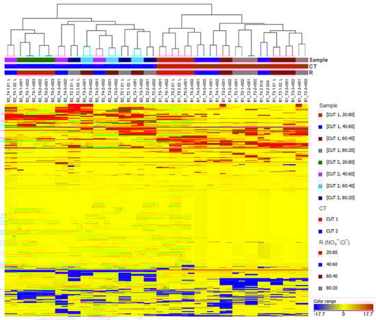 To focus on the difference in the metabolic profiles according to the NO3−:Cl− ratios, significant compounds (Volcano Plot, p < 0.05 and |fold-change| > 2) were identified and listed in the Supplementary Table S3 for CT1 (n = 198) and the Supplementary Table S4 for CT2 (n = 175). Interpretations were done using the omic viewer tool of PlantCyc (Supplementary Figures S2 and S3).