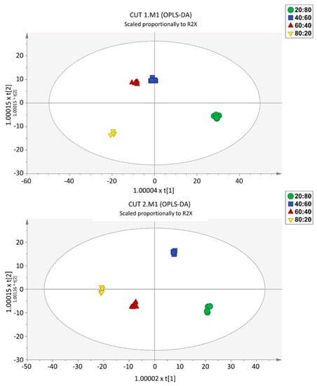 Score plots of Orthogonal Projection to Latent Structures Discriminant Analysis (OPLS-DA) supervised modelling, carried out from untargeted metabolomic profiles of the CT1 (CUT 1, upper) and CT2 (CUT 2, lower).