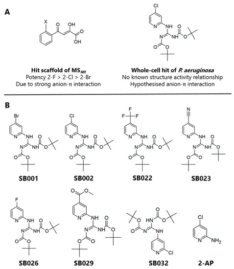 Structures of the 2-aminopyridine analogs characterized in this study. (A) Structures of glyoxylate shunt inhibitors reported in the literature with known or proposed anion-π interactions. (B) Compounds SB001-029 tested in the current work all shared a 2-aminopyridine core structure with tert-butyloxycarbonyl protecting groups, varying only in the substituent at the 4-position of the aromatic ring. SB032 and 2-amino-4-chloropyridine (2-AP) were synthesized as negative controls.