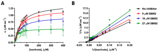 Mode of inhibition of ICLPa by SB002. (A) Kinetic data obtained by titrating isocitrate in the presence of no additions (black symbols), 9 µM SB002 (red symbols), 18 µM SB002 (blue symbols), or 27 µM SB002 (green symbols). (B) The double-reciprocal plot showed that SB002 displayed mixed/noncompetitive inhibition of ICL.