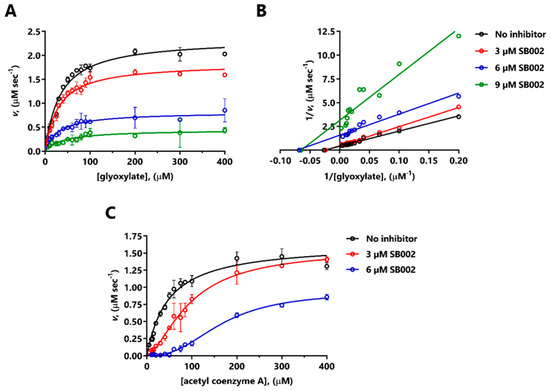 Mode of inhibition of MSPa by SB002. The figure shows the kinetic data obtained in the presence of the indicated concentrations of SB002 and varying concentrations of glyoxylate at saturating (200 µM) acetyl-CoA concentration (A,B), or acetyl-CoA at saturating (200 µM) glyoxylate concentration (C). (A) and (C) show the untransformed data, whereas (B) shows the data transformed in the fashion of Lineweaver–Burk. Due to the change in the kinetic profile from Michaelis–Menten to sigmoidal in (C), we did not carry out a Lineweaver–Burk transformation.