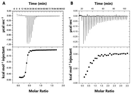 Isothermal titration calorimetry (ITC) data for SB002 binding to MSPa and ICLPa. The top panels illustrate the raw ITC data from 30 equal injections of either (A) MSPa or (B) ICLPa. Both interactions were exothermic. The bottom panels illustrate the respective binding isotherms obtained by plotting the integrated heat peaks against the molar ratio of protein to ligand.