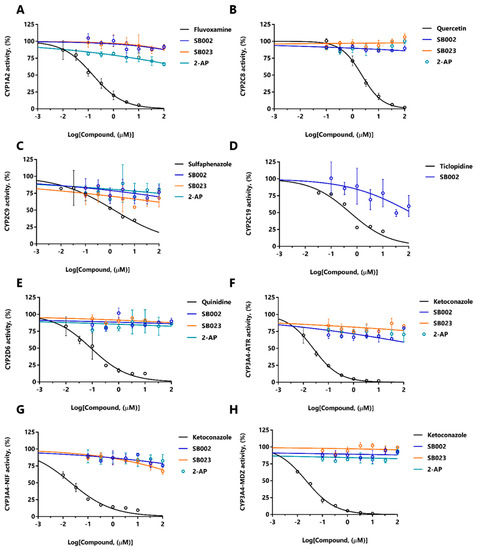 The data in Table 4 suggest that SB002 and SB023 are CYP450 substrates. We, therefore, tested the possibility of potential drug–drug interactions arising from competition between these compounds and a suite of clinically relevant drugs known to also bind to the active site of CYP450s in HLMs. Such drug–drug interactions are important because they may lead to increased serum levels of the unmetabolized form [29]. To assess whether such drug–drug interactions occur, we used LC-MS/MS to examine the products of HLM-associated CYP450 action on a set of drugs that are known to be metabolized by different CYP450 variants. Phenacetin is metabolized by CYP450 variant 1A2, rosiglitazone by CYP450 variant 2C8, mephenytoin by CYP450 variant 2C19, bufuralol by CYP450 variant 2D6, atorvastatin, nifedipine, and midazolam by CYP450 variant 3A4, and diclofenac by CYP450 variant 2C9. By monitoring the ability of SB002, SB023, and 2-AP to interfere with the metabolism of drugs by these CYP450 variants, we were able to establish the possibility of drug–drug interactions. As positive controls, we also treated the HLMs with fluvoxamine (which is known to target CYP450 variant 1A2 and inhibit phenacetin turnover), quercetin (which targets CYP450 variant 2C8 and inhibits rosiglitazone turnover), sulfaphenazole (which targets CYP450 variant 2C9 and inhibits diclofenac turnover), ticlopidine (which targets CYP450 variant 2C19 and inhibits mephenytoin turnover), quinidine (which targets CYP450 variant 2D6 and inhibits Bufuralol turnover), and ketoconazole (which targets CYP450 variant 3A4 and inhibits atorvastatin, nifedipine, and midazolam turnover). The dose-response curves are shown in Figure 5. SB002, SB023, and 2-AP showed no major inhibitory drug–drug interactions over the concentration range tested, although SB002 did show some evidence of interacting with the turnover of mephenytoin (CYP450 variant C19, Figure 5D). By contrast, all positive controls inhibited CYP450s with IC50 values in the nanomolar to submicromolar range (Table S1).