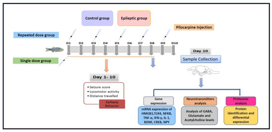 Zebrafish brains were harvested at the end (day 10) of behavior study to determine the molecular changes in the brain. The brains from each group were divided into two halves and each brain was then transferred into trizole to check gene expression levels and another half into methanol for LC-MS/MS studies. The whole process of brain harvesting was done on ice and the brain was immediately frozen at −65 °C in dry ice. The soft skull of the fish was removed first and then the whole brain was extracted with the help of forceps and placed in respective solvent. All the brains were stored at −80 °C until further use. Gene expression studies were carried out to investigate the modulation of several genes (HMGB1, TLR4, NF-κB TNF-α, IL-1, BDNF, CREB-1, and NPY) in normal control and epileptic group injected with single and repeated dose of pilocarpine. All the brain samples were collected in ice-cold 200 µL TRIzol® reagent (Invitrogen, Carlsbad, CA, USA) and immediately stored at −80 °C until further usage. The study was divided into three steps such as isolation of mRNA, synthesis of cDNA strand, and then real-time PCR to estimate the level of the gene expressed.