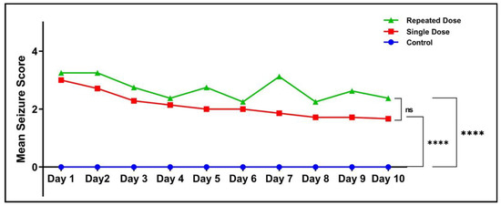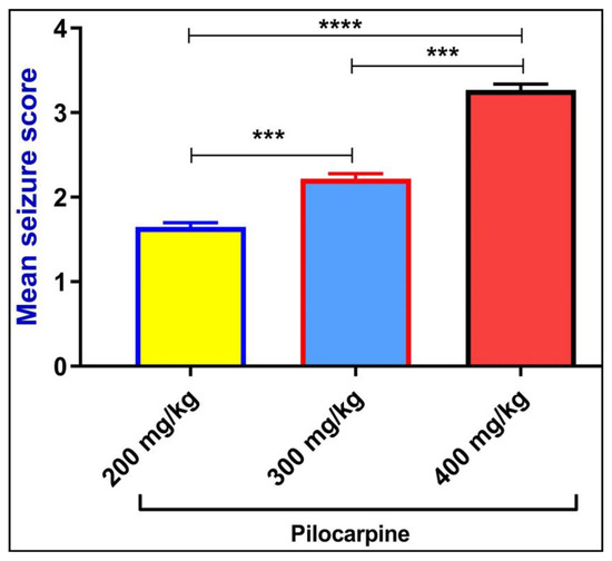 Overall, there was a significant difference (****p < 0.0001) in the mean seizure score between the control group and the single dose group. In addition, a significantly higher (****p < 0.0001) seizure score was observed in the repeated dose group when compared to the control group. However, no significant difference in the mean seizure score was observed between single and repeated dose pilocarpine group (Figure 3).