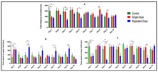 Total distance travelled, time spent in upper and lower half of the tank. All the values are expressed as mean ± SEM, and each data point shows the average of ten fish in each group (n = 10). Statistical analysis was carried out using two-way ANOVA, p < 0.05 was considered significant, *p < 0.05, **p < 0.01, ***p < 0.001. Total distance travelled in a tank (A), time spent in upper half (B), and time spent in lower half (C).