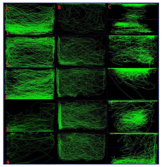 Comparison of locomotor pattern and behavior of fish. Single dose and repeated dose of pilocarpine treatment versus normal control. Representative swimming patterns (behavior recording) for the corresponding three experimental groups (A–C). The swimming pattern for the group (A) represents the 10% DMSO only vehicle control. The swimming pattern for the group (B) represents the single dose of Pilocarpine (400 mg/kg) whereas the swimming pattern for the group (C) represents the repeated dose of Pilocarpine (400 mg/kg) for 10 days. The number in the rows represents the swimming pattern of the specific day (1, 3, 5, 7, 9).