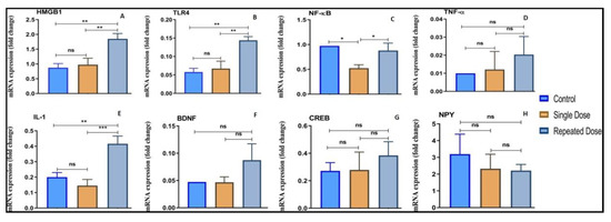 There was a significant increase (**p < 0.01) in the mRNA expression level of HMGB1 in the repeated dose group as compared to the normal control group. In addition, there was a significant upregulation (**p < 0.01) in the mRNA expression of HMGB1 in the repeated dose group as compared to the single dose group. However, there were non-significant (ns) elevation in the single dose group when compared to the control group. The HMGB1 expression level for each group is graphically represented in Figure 6A.