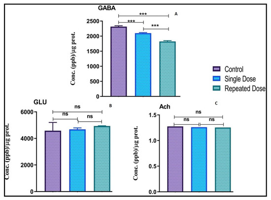 The level of the brain neurotransmitters such as GABA, Glutamate (Glu), and Acetylcholine (Ach) were analyzed using LC-MS/MS following the earlier documented study [21,51]. Stock solutions of the neurotransmitters were prepared in methanol (0.1% formic acid) to make up a final concentration of 1 mg/mL. The stock solutions were kept at 4 °C until needed. A range of 2000 to 125 parts per billion (ppb) was used for calibration. Each zebrafish’s brain was first homogenized in 200 µL of ice-cold methanol (1% formic acid). The homogenate was then vortex-mixed for 1 min and later centrifuged at 18,000× g for 10 min at 4 °C. Finally, the supernatant was pipetted into vials for LC-MS/MS analysis.