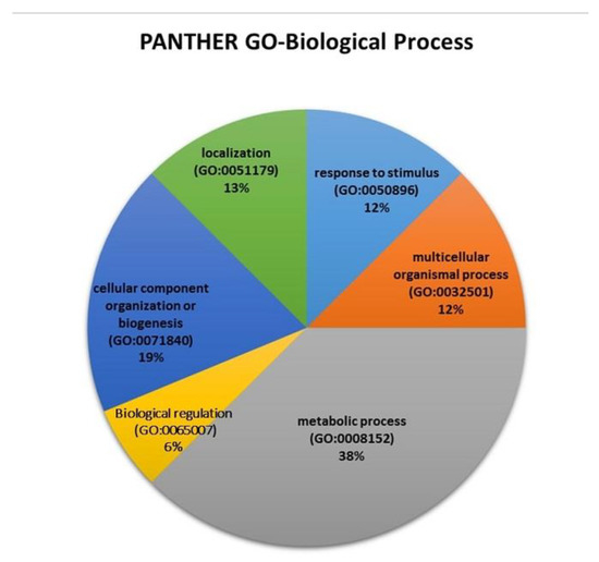 Biological process for the differentially expressed proteins. Biological processes for the differentially expressed proteins identified from the label free quantification approach. The pie chart was generated using PANTHER GO-classification system software.