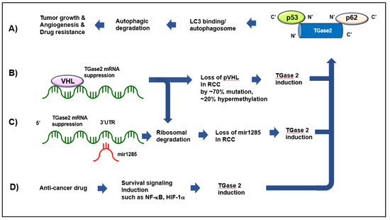 Various pathways inducing TGase 2 expression, as well as the major role of TGase 2 in ccRCC. (A) TGase 2 can form a complex by binding p53 and p62 simultaneously, which is then transferred to the autophagosome [21,22]. (B) VHL inactivation in about 90% of ccRCC induces TGase 2 expression, which can potentiate suppressing p53 signaling [68]. (C) Universal decrease of mir1285 level in RCC induces TGase 2 expression, which correlates with RCC proliferation [69]. TGase 2 mRNA expression is suppressed by mir1285 binding at 3′UTR of TGase 2. (D) TGase 2 expression is also induced by anti-cancer drug treatment along with drug resistance through NF-κB activation [42,70]. All of these pathways can be reversed by a single treatment of GK921 [71] or streptonigrin [23], which binds to the N-terminus of TGase 2 where p53 would bind, prior to transfer to the autophagosome in ccRCC [64].