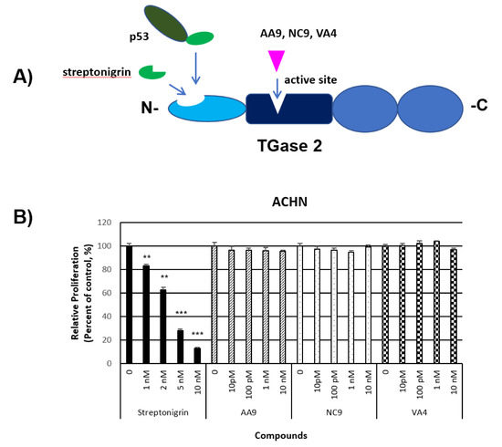 Inhibitor targeting the N-terminus p53 binding region of transglutaminase 2 (TGase 2) shows an anti-cancer effect in clear cell renal cell carcinoma (ccRCC), cell line ACHN. (A) Streptonigrin binding to N-terminus of TGase 2 stabilized p53, which induced apoptosis in ccRCC. AA9, NC9, and VA4 binding to active site of TGase 2 caused inactivation of TGase 2. (B) Cells were tested for proliferation assay using sulforhodamine B assay as reported [23] for 48 h with the indicated concentrations of streptonigrin, AA9, NC9 and VA4 compounds. Streptonigrin showed an anti-cancer effect in a dose-dependent manner, while TGase 2 active site inhibitors such as AA9, NC9, and VA4 [72] did not show an anti-cancer effect in ccRCC. This suggests that TGase 2 mediated p53 depletion is not dependent on enzyme activity but related to an N-terminal binding chaperone effect to the autophagosome. (mean ± SD, n = 3) ** p < 0.01, and *** p < 0.001.