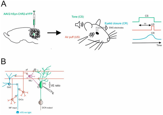 The cerebellum is known to be involved in eyeblink conditioning (EBC), which is often used in investigations involving the cerebellum in physiological and pathological conditions. In EBC, a neutral conditioned stimulus (CS, either visual or auditory) anticipates an aversive unconditioned stimulus (US), usually an air puff delivered to the eye or a peri-orbital shock, see [19,20], that causes the animal to close an eyelid out of protection. After multiple presentations of CS and US with the same temporal pattern, the animals learn to associate the CS with the following US, resulting in the closing of the eyelid when the CS (neutral stimulus) is delivered, anticipating the aversive stimulation (US). CS and US signals are conveyed to the cerebellum through distinct input pathways, the mossy fibers and the climbing fibers, respectively [21]. Both these inputs project to the cerebellar cortex and send collaterals to the DCN, where learning is thought to take place [19,21,22]. So far, investigations on EBC mechanisms have focused mainly on the role of the cerebellar cortex and, in particular, of long-term depression and long-term potentiation at the fiber parallel to the PC synapse [23,24,25,26,27,28], intrinsic plasticity of PCs [25,29], and their dependence on the external feedback provided by the climbing fibers [30,31]. Indeed, it has been shown that electrical stimulation of mossy fibers is able to substitute the sensory CS to drive eyelid conditioning in rabbits [32]. Optogenetic stimulation has the advantage of avoiding tissue damage provoked by current injection and allows for the precise activation of neuronal subpopulations or specific pathways. For these reasons, optogenetics was applied in several studies investigating cerebellar role in associative learning. A recent study extensively applied this technique in order to investigate the impact of behavioral states on associative learning, the pathways and neuronal types involved [33]. The CS was mimicked as optogenetic activation of cerebellar mossy fibers, using Thy1-ChR2/EYFP transgenic mice expressing channelrhodopsin 2 (ChR2) in cerebellar mossy fibers (MF-ChR2 mice). In particular, the authors show that locomotion is able to enhance associative learning (using delay EBC as a model), exploiting optogenetics to selectively activate mossy fibers terminals (mimicking the CS) in a specific region of the cerebellar cortex involved in eyelid movements. Their results showed that locomotor contribution to eyelid closure during the task is likely to rely on mechanisms involving the mossy fiber pathway (CS) and downstream. Optogenetics was further used to address the contribution of cerebellar neuronal types, showing that the processing of the input downstream of the mossy fibers is deeply involved in the associative learning process and that the different neuronal types impact differently on the timing of the response (with milliseconds precision). It is evident that optogenetics was key to obtain this kind of factorization of the process underlying associative learning in the cerebellum.