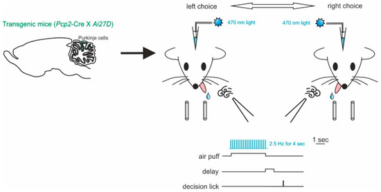 Working memory is a fundamental part of the decision-making process. These are fundamental cognitive functions involving distributed interacting network of different brain areas, with the prefrontal cortex at the core [133]. The cerebellar contribution to working memory has been reported by several studies in humans. Cerebellar damages or dysfunctions often lead to working memory impairments [3,134,135,136]. In order to investigate this aspect of cerebellar function in behaving mice, Deverett and colleagues exploited optogenetics to test whether direct, precise and transient disruption of cerebellar activity modulated the accumulation of sensory information in working memory [129]. Mice expressing ChR2 in PCs were obtained by crossing mice with genotypes Pcp2-Cre for PC specificity and Ai27D for ChR2. The authors showed the optogenetic manipulation of PC-impaired decision making by reducing the ability to effectively retain past information in working memory (Figure 4). In particular, they tested the accumulation of sensory information using a behavioral task for head-fixed mice. In each trial, the animal received air-puffs directed both on the left and right whisker pads, simultaneously, for seconds (sensory evidence presentation). After a delay, an auditive cue signaled that the mouse could retrieve a water reward, either by licking a left- or right-placed port. The task was successful, and the reward delivered, when the licking direction was the same as the whisker pad which received more air-puffs (see Figure 4 for a schematic representation of this task). ChR2-expressing PCs were stimulated during the sensory evidence presentation, preceding the decision, and led to reductions in performance accuracy. In this case, the use of optogenetics allowed the researchers to narrow down the specificity of the effect on behavior to a single neuronal type, the PCs, that provide the sole output of the cerebellar cortex. While the use of mutant mice could have helped identifying an important role of these neurons, optogenetics provided the advantage to modify neuronal activity in a transient way. This allowed them to modify neuronal activity in only the temporal window significant for the accumulation of the sensory evidence in working memory. The transient and reversible nature of the optogenetic interference with neuronal activity allowed to rule out possible motor impairments leading to failing the test and reinforcing the concept that the cerebellar cortex is indeed involved in sensory evidence retainment for working memory. These results may help account for the many clinical findings linking cerebellar activity to working memory and decision making in humans [103,136,137,138]. Since working memory is considered dependent on the activity of forebrain regions [139,140], it is likely that the cerebellar role described above is mediated by indirect cerebellar–neocortical projections. Further investigations on the subject would definitely benefit from optogenetics use to dissect cerebellar pathways.