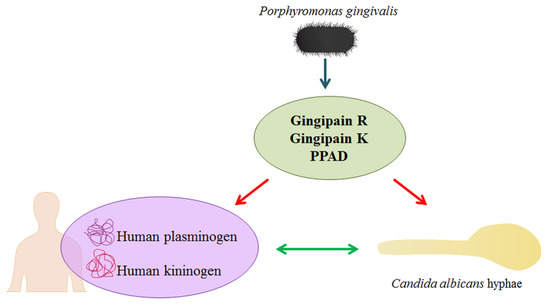 The pathogenic potential of C. albicans is mainly dependent on the production of secreted aspartyl proteinases (SAPs), as well as numerous adhesive proteins present at the surface of the fungal cells that include typical adhesins, e.g., the family of agglutinin-like sequence proteins, and some atypical surface-exposed proteins (often classified to the “moonlighting proteins”, i.e., proteins with many different functions, often performing them at a distinct cellular location than the original one) involved in interactions with proteins of other co-inhabiting microorganisms or with host proteins [17,26,27,28]. It is well known that both of these microbial pathogens are capable of interfering with the important plasma proteolytic cascades, i.e., coagulation, fibrinolysis and the contact system, responsible for maintaining homeostasis and hemostasis in humans [29,30,31,32,33]. Thus, microbial secretory proteases can affect the activity of the enzymes in these cascades, and bacterial and fungal surface proteins can attract individual proteinaceous components of these systems to the pathogen cell surfaces for the local increase in protein concentrations and the modulation of their activity. One of such essential plasma proteins that can be seized by pathogens is plasminogen (HPG), which after its activation to plasmin is involved in the lysis of fibrin clots, regulation of the complement cascade, and activation of the matrix-metalloproteinases responsible for tissue remodelling [34,35]. Another protein, whose role in inflammation is critical and which can be used by the pathogens during infection, is high-molecular-mass kininogen (HK), which apart from its function in the intrinsic coagulation pathway is also the precursor of the vasoactive, proinflammatory peptide mediators, the kinins [36]. HPG has been shown to be effectively activated to plasmin by the P. gingivalis gingipains, thereby contributing to gingival tissue destruction [37]. Similarly, the adsorption of HPG at the cell surface of C. albicans cells greatly facilitates the dissemination of these fungal cells in the host organism, enabling them to cross the blood–brain barrier [38].