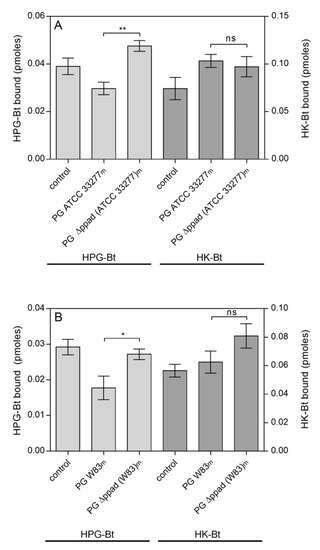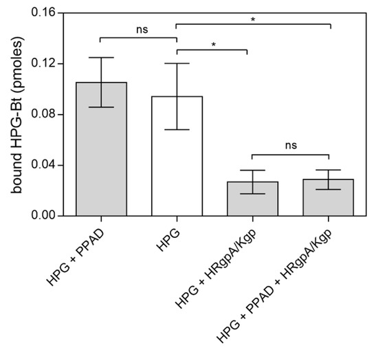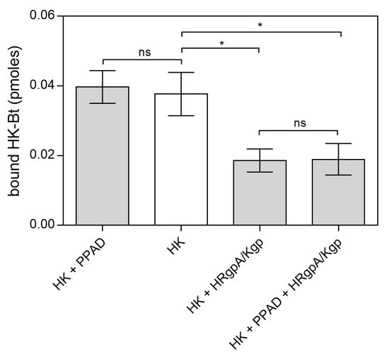 Similarly, to the previous instance, the bound HPG-Bt level seemed to depend on PPAD activity because the binding of this human protein was noticeably lower for citrullinated C. albicans cells than for their non-modified counterparts. In contrast, the binding of HK-Bt appeared to be independent of PPAD activity as the difference between HK-binding by PPAD-treated and untreated cells was not significant.